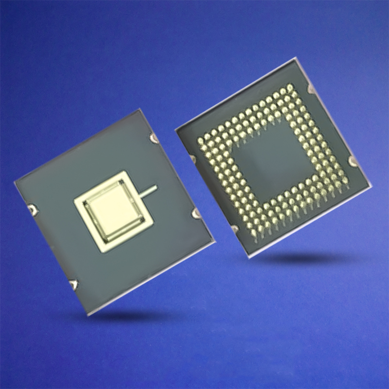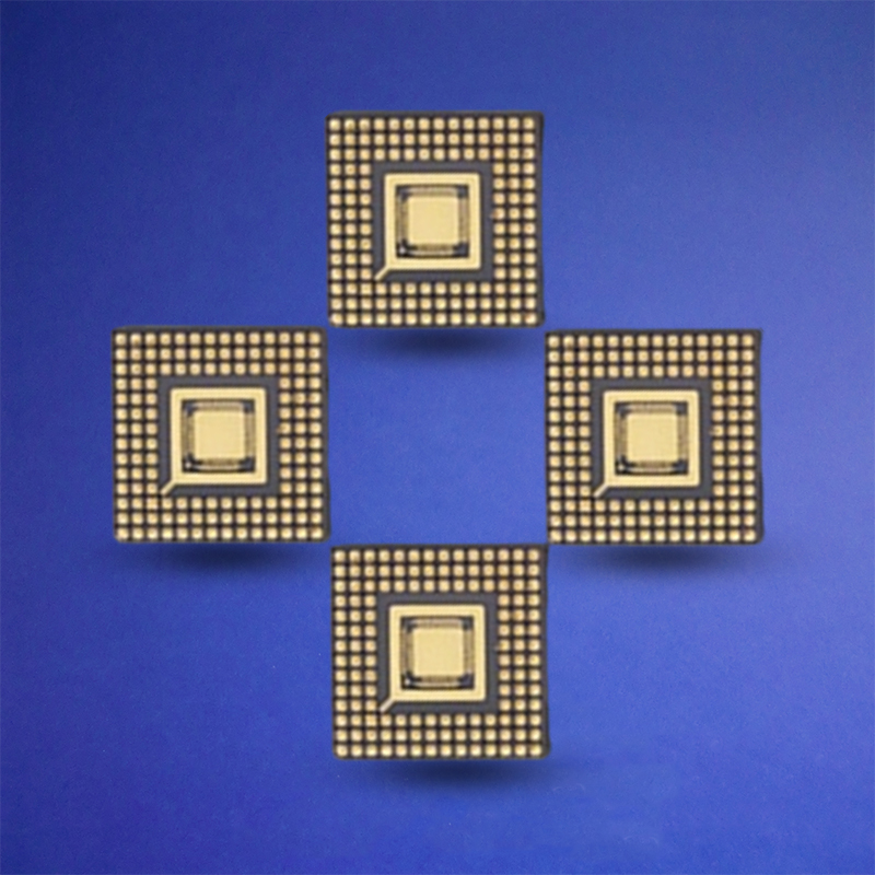 陶瓷针栅阵列外壳(CPGA)产品可选材料涵盖氧化铝、氮化铝、玻璃-陶瓷复合材料及可伐合金,并配套钨-锰或钼-锰厚膜金属化层以优化电气连接。可提供 2.54mm 引脚节距的标准规格。